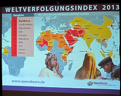 Vorgestellt wurden am Abend exemplarisch die Situationen der Christen in den Ländern Nordkorea, Syrien und dem Iran, die zu den elf Staaten gehören, in denen Christen zur Zeit am stärksten Repressionen durch Staat und Gesellschaft ausgesetzt sind. „Open Doors“ veröffentlicht dazu von Zeit zu Zeit einen „Weltverfolgungsindex“, auf dem diese Länder zu finden sind. Besondere Brisanz besaß das Thema, da sich momentan christliche Flüchtlinge aus dem Iran in der örtlichen SELK-Gemeinde befinden, die Christenverfolgung am eigenen Leib erlebt haben.